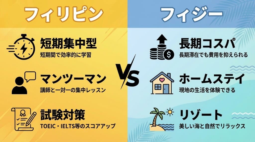 > フィリピン留学とフィジー留学の比較表